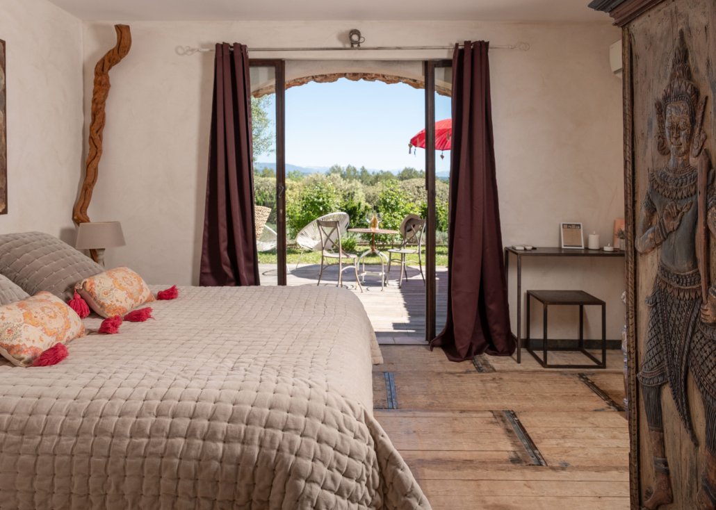 Chambre pensée comme un refuge confidentiel, Entre Vous et Nous se dévoile à l’abri des regards, là où la nature s’invite avec douceur dès l’entrée de plain-pied. La terrasse privative s’ouvre sur le jardin et la piscine, prolongeant naturellement l’espace vers l’extérieur, dans une atmosphère paisible et préservée.