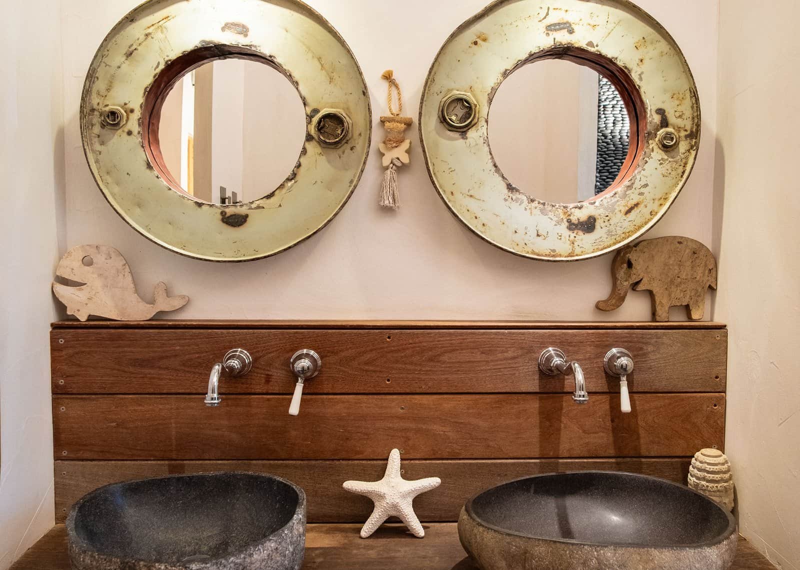 La salle de bain, résolument minérale, se distingue par une cascade de calades noires, galets de Sumatra dialoguant avec l’eau et la lumière. La douche, ouverte sur la nature grâce à une large vitre, offre un moment suspendu, entre intérieur et extérieur.