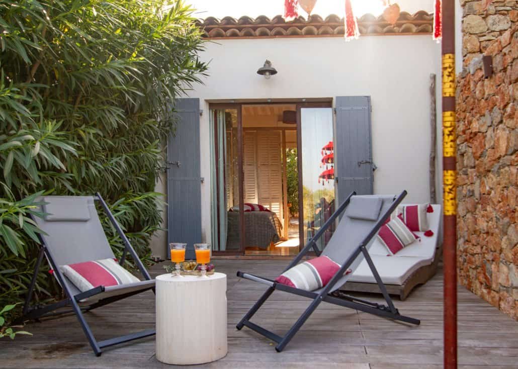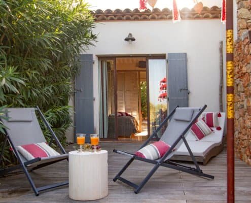 Cette suite s’ouvre de plain-pied sur deux horizons. Traversante, elle offre d’un côté une vue apaisante sur le jardin et la piscine, de l’autre un regard dégagé vers les collines environnantes. La terrasse privative prolonge naturellement cet équilibre entre intérieur et extérieur, invitant à savourer chaque instant au rythme du paysage.