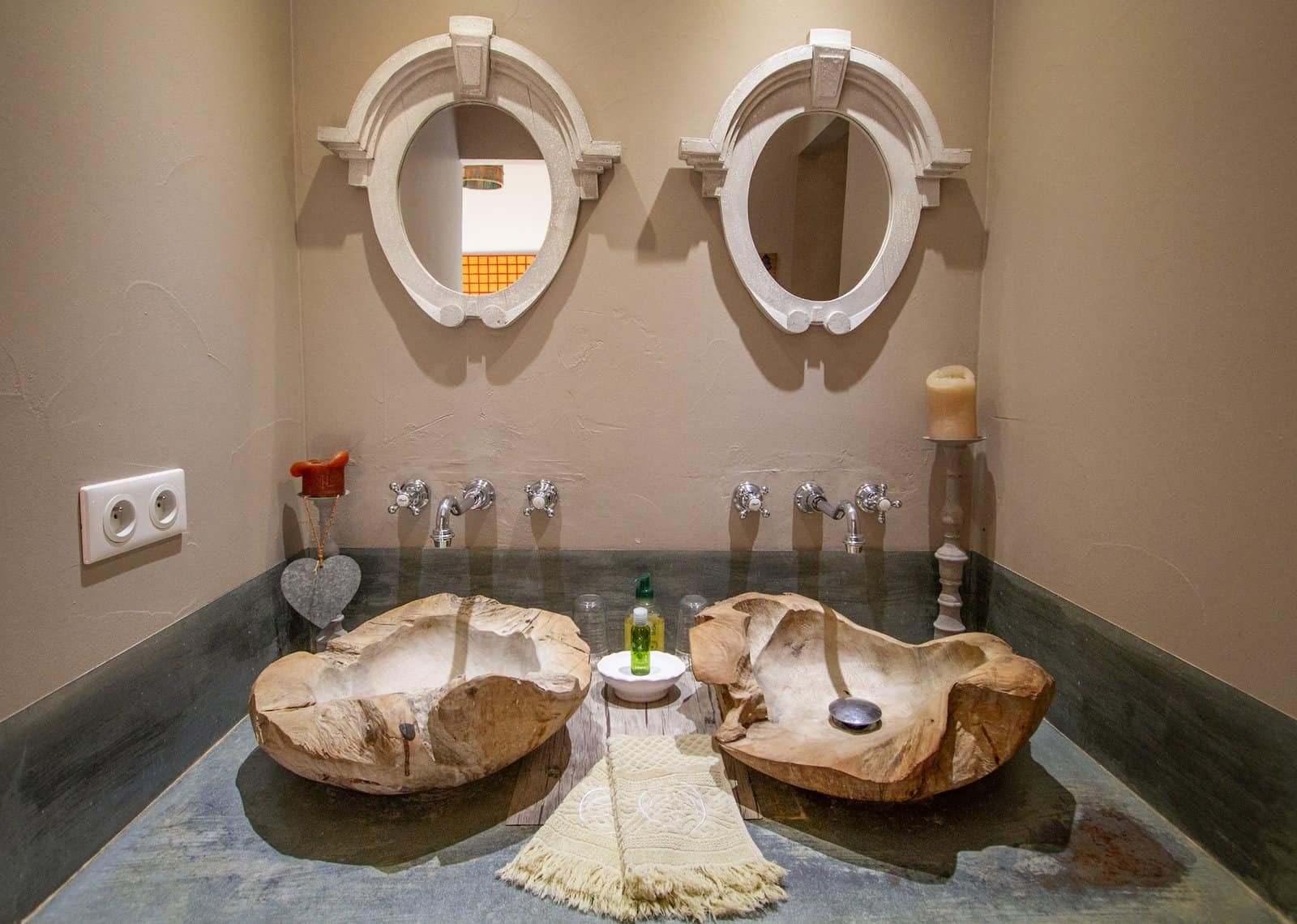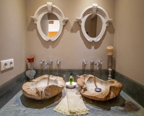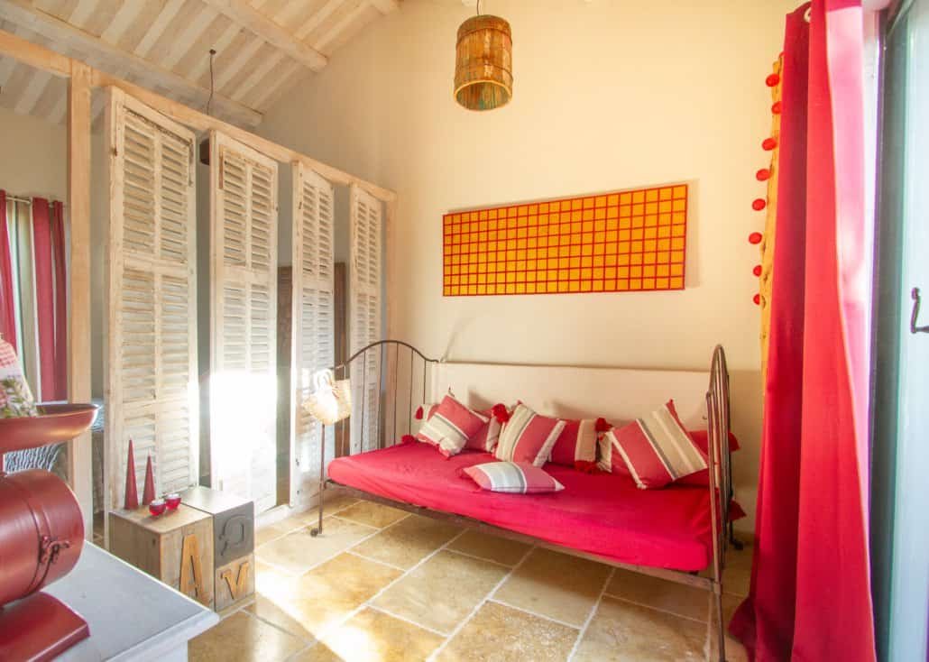 À l’intérieur, la suite dévoile un espace généreux composé d’un petit salon et de deux chambres distinctes. L’atmosphère est boisée et chaleureuse, portée par une décoration raffinée où chaque détail trouve sa place. Portes persiennes, bois tropical, plafond provençal et touches végétales composent un univers élégant et authentique.