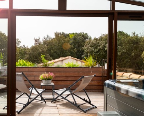Entrée privative, climatisation, lit king size (180/200), douche à l’italienne, double vasque, baignoire en pierre (produits de bains & peignoir), jacuzzi, coin salon, mini frigidaire, connexion internet wi-fi, terrasse privative. Certains équipements présentés peuvent différer selon les chambres.